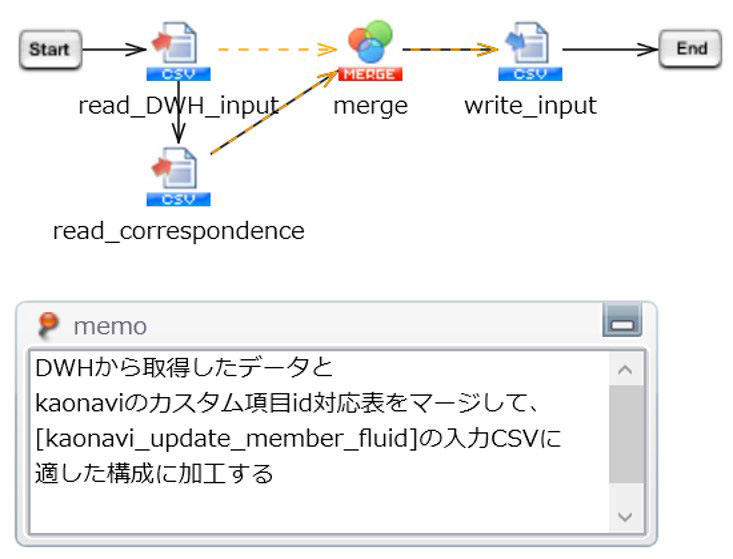 社員の業務内容ごとの経験時間データと業務内容に対応するカオナビの項目IDのデータをマージし、入力用CSVファイルとして出力します。