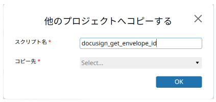 コピー先プロジェクトを選ぶダイアログボックスが表示されるので、「1. 導入のための準備をする」で作成したコピー先プロジェクトを選択して「OK」を押しましょう。