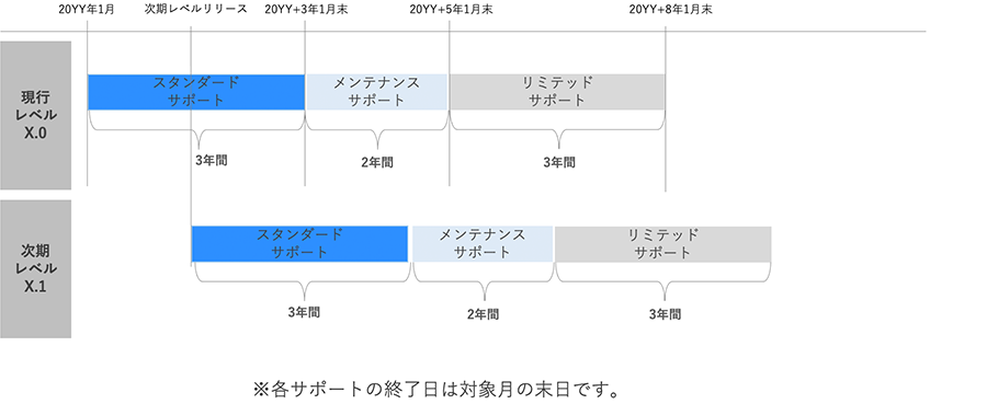サポートレベルの提供期間は製品のレベルで決まり、最新レベルのリリース時に公開します。